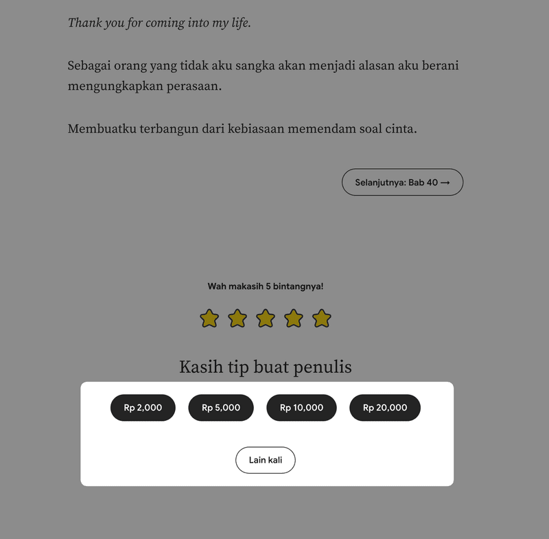 - Setelah memberikan rating 1-5, pembaca akan diberikan opsi untuk memberikan Tip kepada penulis
