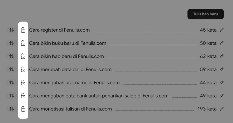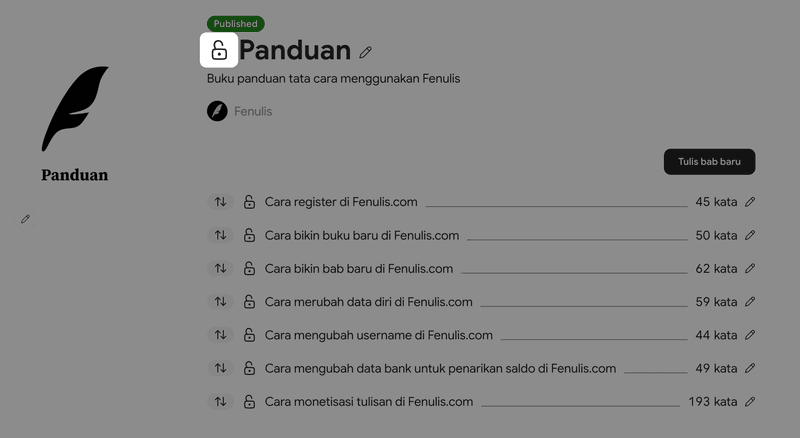 - Klik icon gembok yang berada di samping kiri bab yang ingin kamu jual