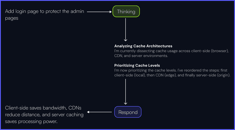 Proses berpikir ini sering disebut sebagai Chain of Thought. LLM diinstruksikan untuk berpikir dan ngomong sendiri untuk merencanakan langkah-langkah untuk menyelesaikan sebuah tugas. Ketika digabung dengan perkakas lainnya, bisa menjelma menjadi sebuah framework seperti ReAct (Reason + Act) yang lebih powerful. Reasoning loop ini adalah "nyawa" dari agentic coding.