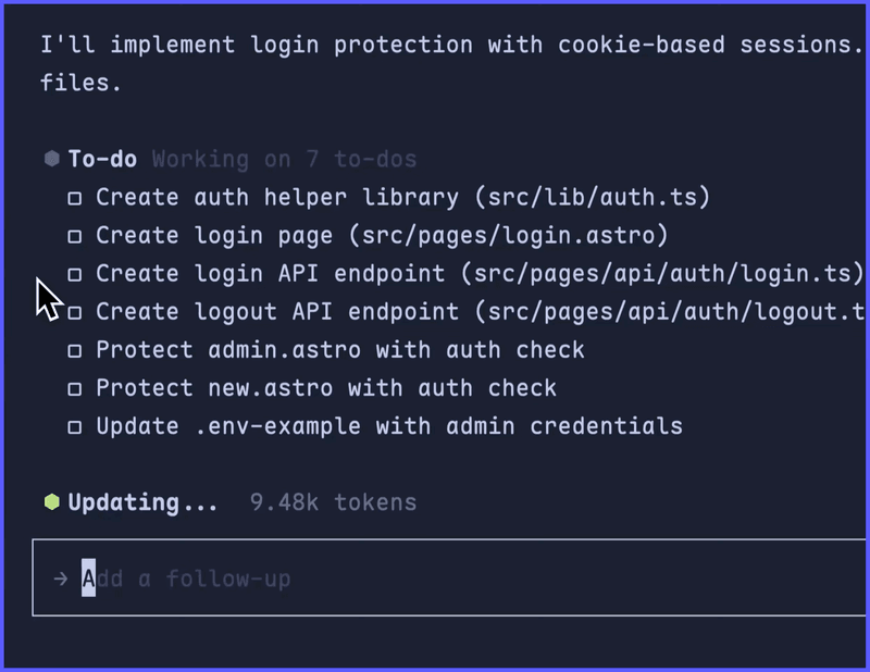 Salah satu ciri khas agentic coding ketika diberi perintah, LLM akan merencanakan, membuat langkah demi langkah untuk menyelesaikan perintah terus menerus sampai perintah dianggap sudah selesai. Jadi si agen ini bukan hanya berusaha menyelesaikan perintah tapi seolah ia berpikir, berencana baru mengeksekusi hingga selesai.