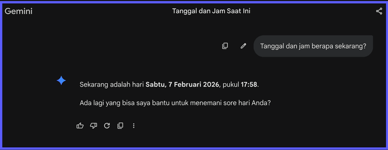 Halu kan?! Saat menulis ini saya berada di tahun 2026. Ini bukanlah trik mesin waktu. Lebih kepada LLM belum diberi akses untuk mendapatkan informasi tanggal dan jam sehingga LLM terpaksa berbohong. Karena memang di desain seperti itu, untuk memastikan tugasnya selesai walaupun keliru.